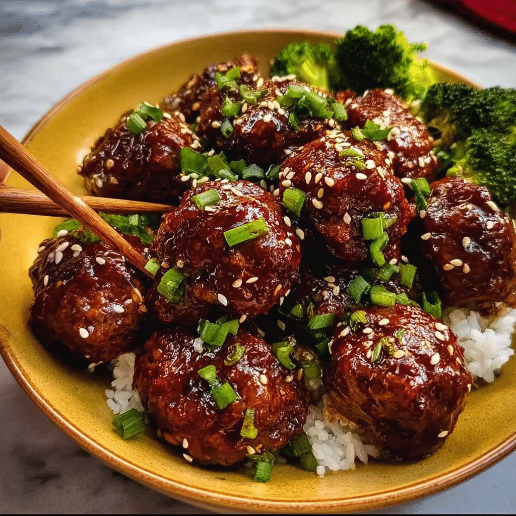 - Serve the meatballs and remaining sauce over bowls of rice topped with additional green onions and sesame seeds. Serve the broccoli on the side.