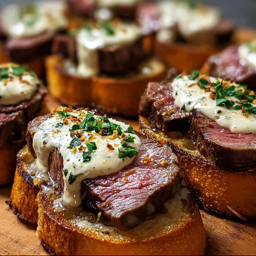 Beef Tenderloin Crostini with Parmesan Cream Sauce
