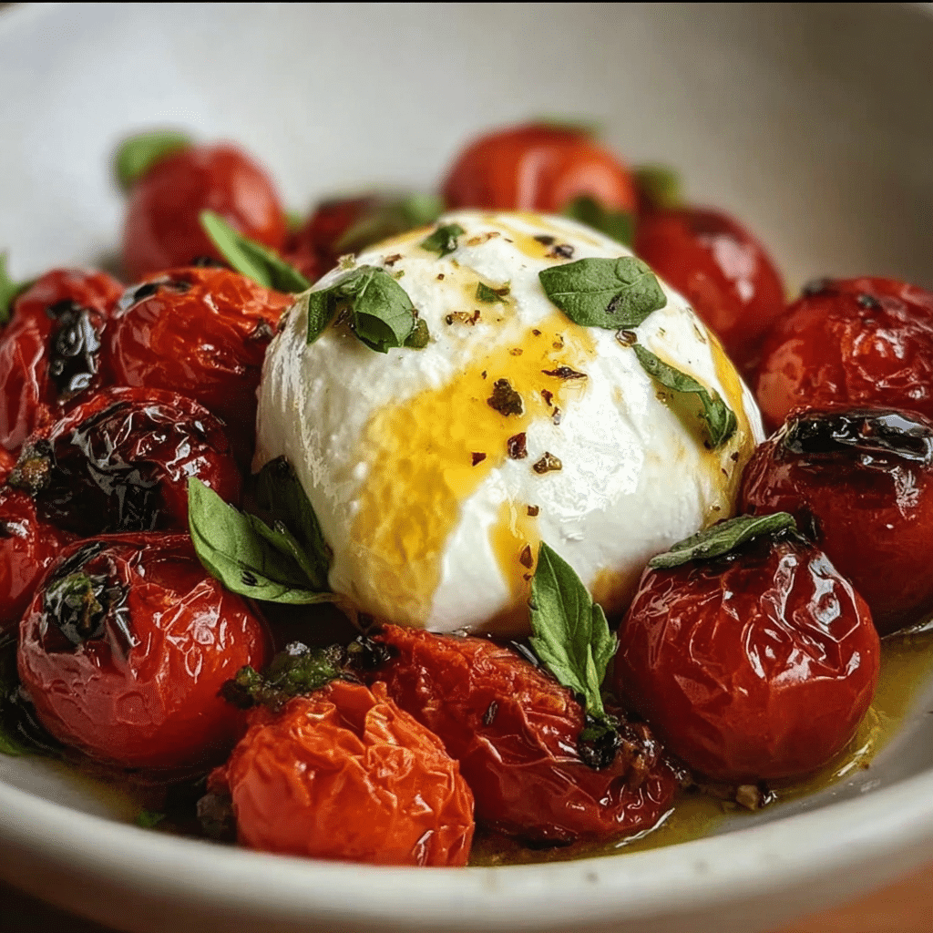 Roasted cherry tomatoes with burrata are a delightful and visually appealing dish. Start by tossing the cherry tomatoes with olive oil, salt, and pepper, then roast them at 400°F (200°C) for about 20 minutes until they burst and caramelize. Once roasted, let the tomatoes cool slightly, then serve them on a platter with fresh burrata, allowing the creamy cheese to meld with the sweet tomatoes. This dish is great as a standalone appetizer or alongside toasted baguette slices for a complete experience.