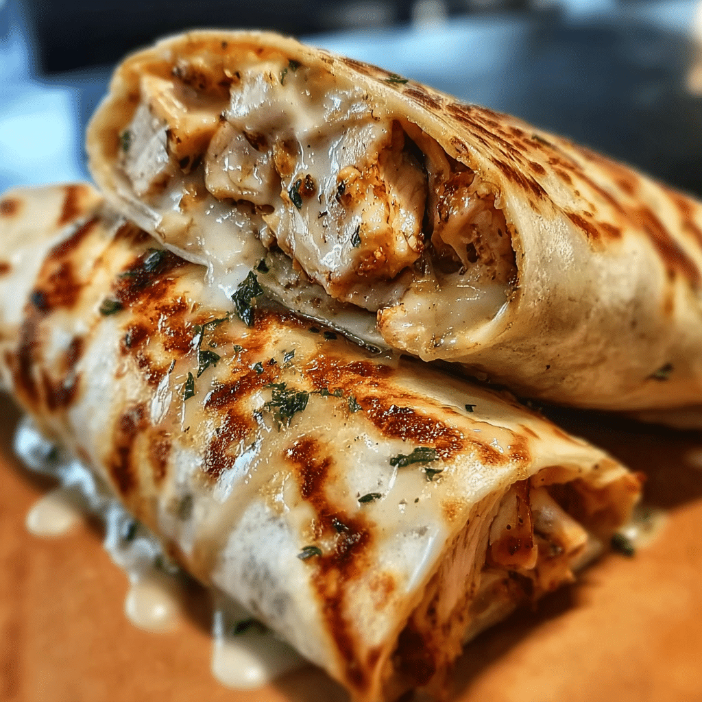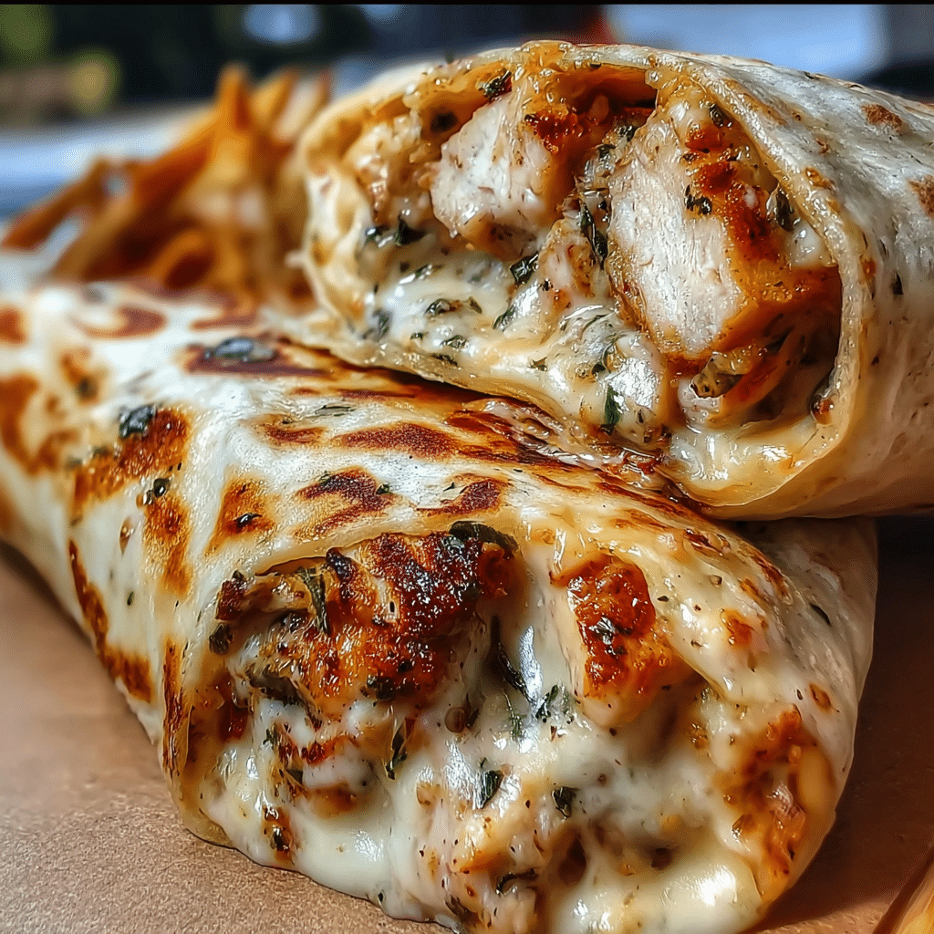 A delicious cheesy garlic chicken wraps recipe begins with marinating your chicken in garlic, olive oil, and your favorite herbs for at least 30 minutes. Cook the chicken thoroughly, then shred it and combine it with a generous amount of cream cheese and shredded cheese, ensuring everything is well mixed. Spoon the mixture onto tortillas, roll them up, and place them seam-side down in a baking dish. Bake at 350°F (175°C) for about 15-20 minutes until the wraps are crispy and the cheese is bubbling. You can also add toppings like jalapeños or diced tomatoes for an extra kick.