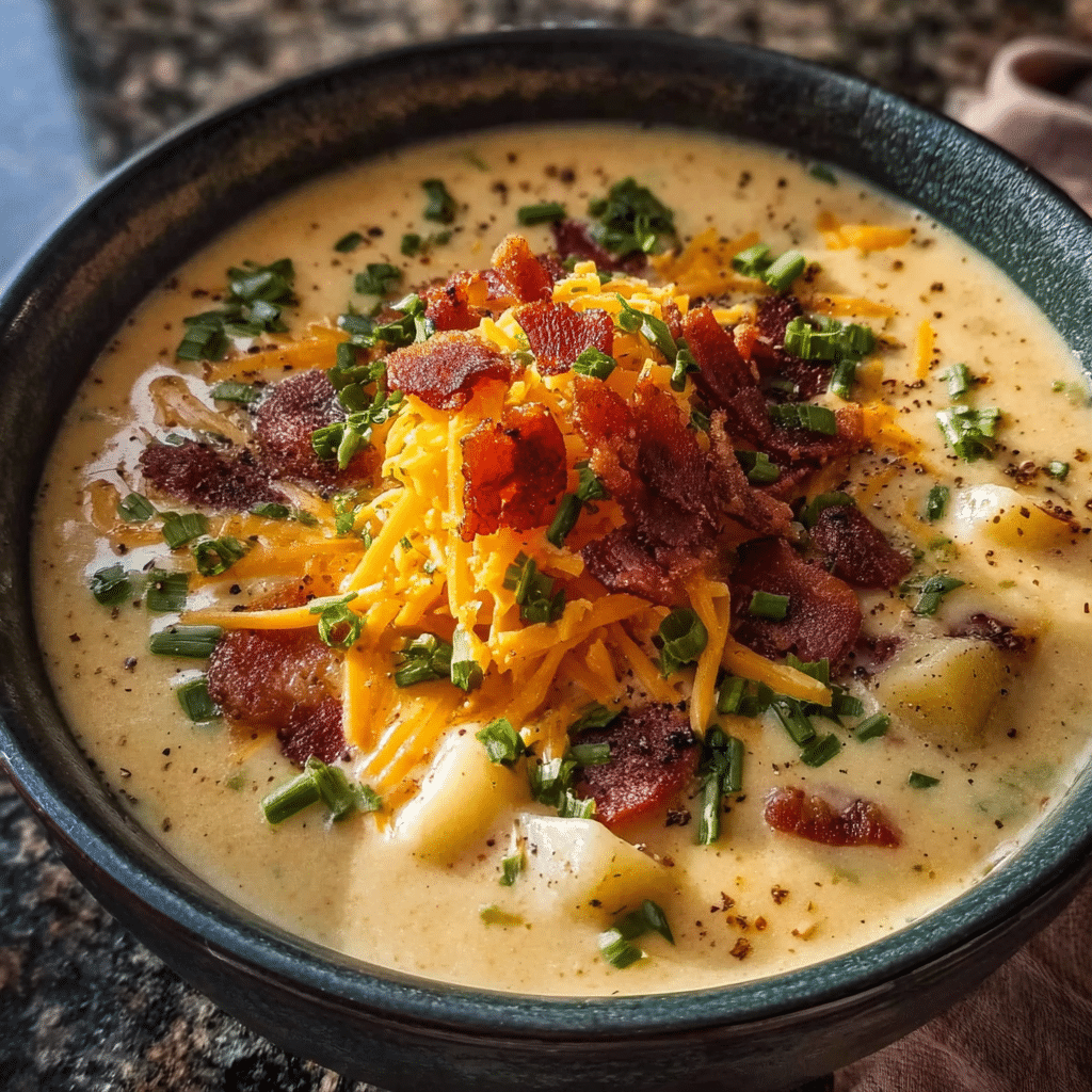 comforting loaded baked potato soup. Serve the soup in rustic bowls for a cozy feel. A sprinkle of freshly chopped chives or crispy bacon bits on top not only adds color but also provides a delightful texture contrast. For an elevated touch, drizzle a swirl of sour cream or crème fraîche in the center before serving.