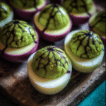 A delicious Halloween deviled eggs recipe can be both spooky and delightful! Start with hard-boiled eggs, and after peeling, slice them in half and remove the yolks. Mix the yolks with mayonnaise, mustard, salt, and a dash of vinegar for that classic deviled egg flavor. For a Halloween twist, add green food coloring to the yolk mixture, and pipe it back into the egg whites. You can garnish with paprika, crumbled bacon, or even use a slice of olive to make a “witch’s eye” on top. For an extra creepy effect, use a toothpick to create spider webs by drizzling some sriracha or ketchup on the serving platter!