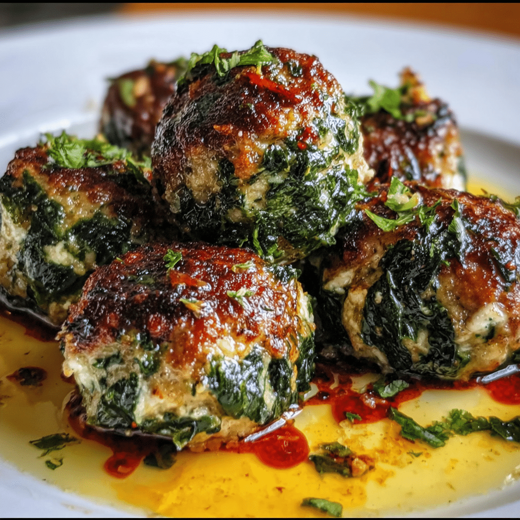 If you’re feeling adventurous, why not try a Mediterranean spin? Incorporate feta cheese, olives, and sun-dried tomatoes into your meatball mixture. The salty, briny flavors will contrast beautifully with the garlicky spinach, making for an unforgettable dish. Serve these meatballs with a side of tzatziki sauce for dipping, and you’ve got a meal that’s bursting with flavor.