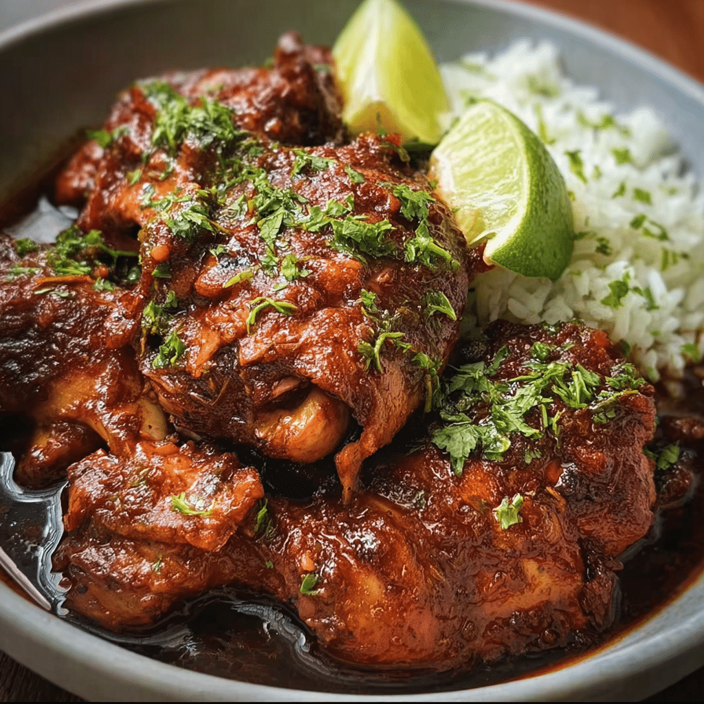 - Serve: Slice the chicken and serve it over a bed of rice or alongside warm tortillas. Drizzle extra sauce over the top and garnish with fresh cilantro for a pop of color and flavor.
