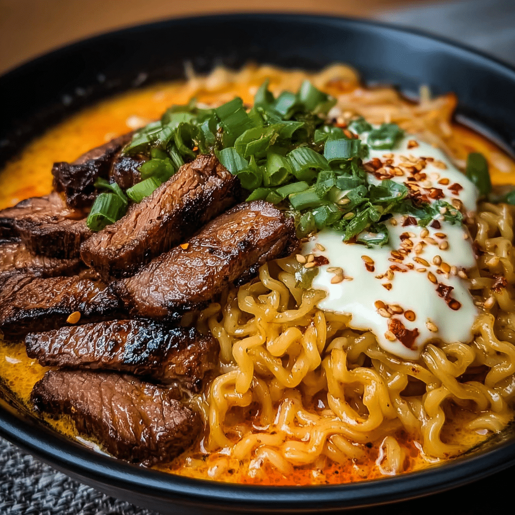 Spicy Korean Ramen with Grilled Beef & Creamy Sauce
