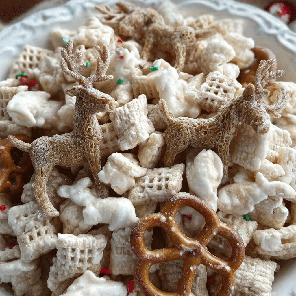 Reindeer chow Muddy Buddies is a festive twist on the classic Muddy Buddies recipe, which typically features Chex cereal coated in chocolate and powdered sugar. In this holiday variation, the Muddy Buddies are made using white chocolate instead of milk chocolate, giving them a lighter, sweeter flavor. To prepare them, you melt white chocolate and mix it with peanut butter or simply use it alone, then combine with Chex cereal and coat with powdered sugar for that signature finish. You can also add festive mix-ins like red and green M&M’s or holiday-themed sprinkles to enhance the appearance and make them even more festive. These treats are perfect for sharing during the holiday season!